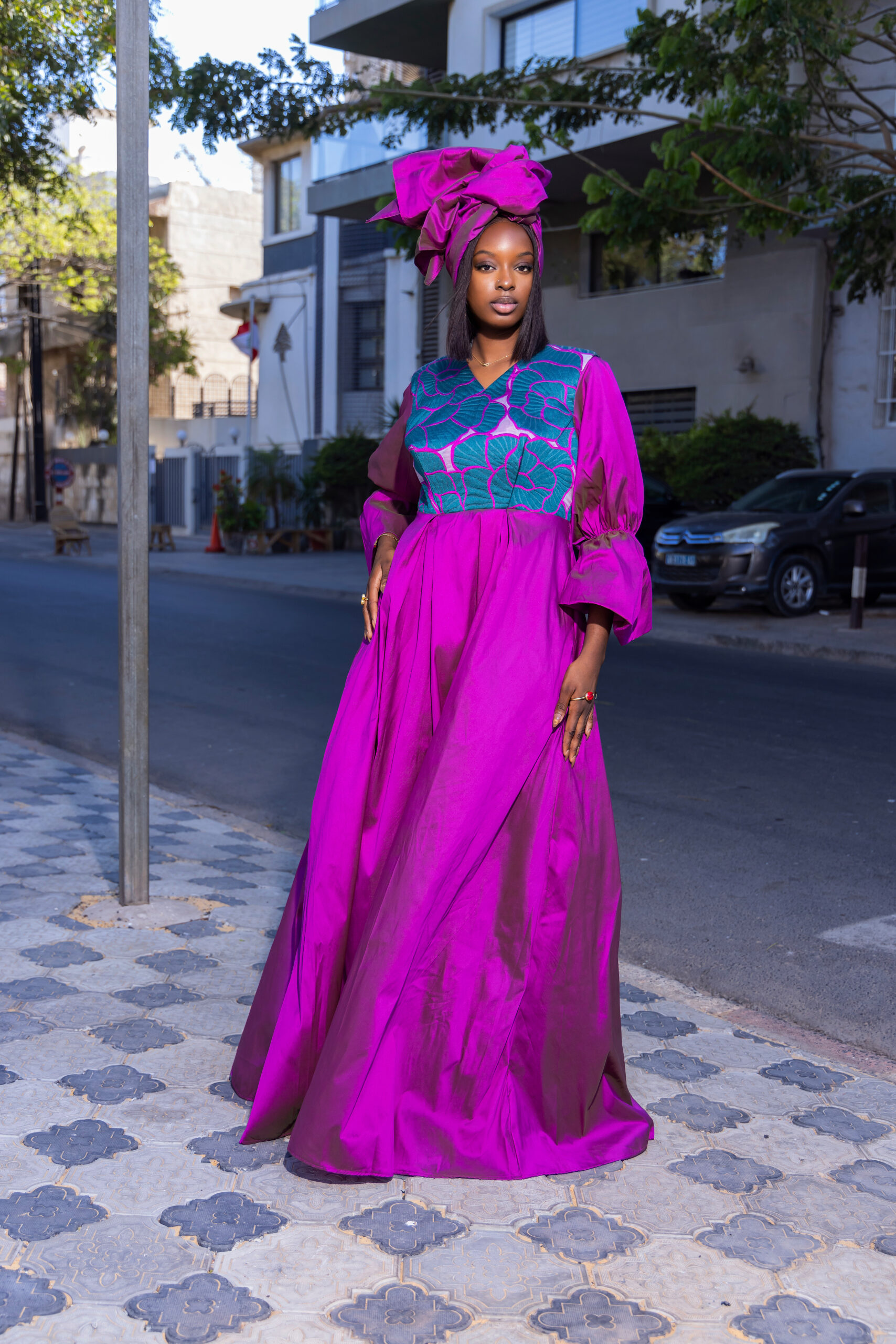Une silhouette audacieuse et sophistiquée. Le contraste entre le fuchsia intense et le vert texturé crée un équilibre unique, sublimé par un headwrap assorti. Une tenue forte, pensée pour les femmes qui assument leur style avec élégance à Dakar.